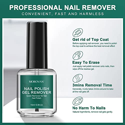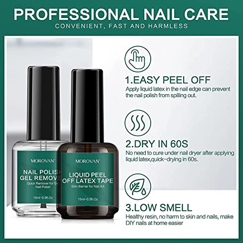 Morovan Nail Remover Kit Gel Nail Polish Remover Non-Acetone with Latex Tape Peel Off Liquid Professional Quick Easy Remove Soak-Off UV Gel Polish Color Paints Coat, 15ml/0.5fl.oz